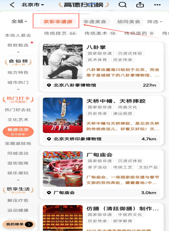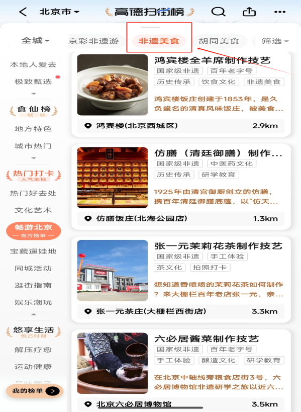市民和游客通过高德地图搜索“畅游北京·京彩非遗游”或“非遗美食”,即可一键导航至西城区各非遗点位,在线查看项目介绍、体验攻略、用户评价等信息,轻松实现“指尖上的非遗导览”(“畅游北京”榜单进入方式:打开高德地图→点击中间下方位置高德扫街榜→点击左侧“畅游北京”→点击上方京彩非遗游或非遗美食)。