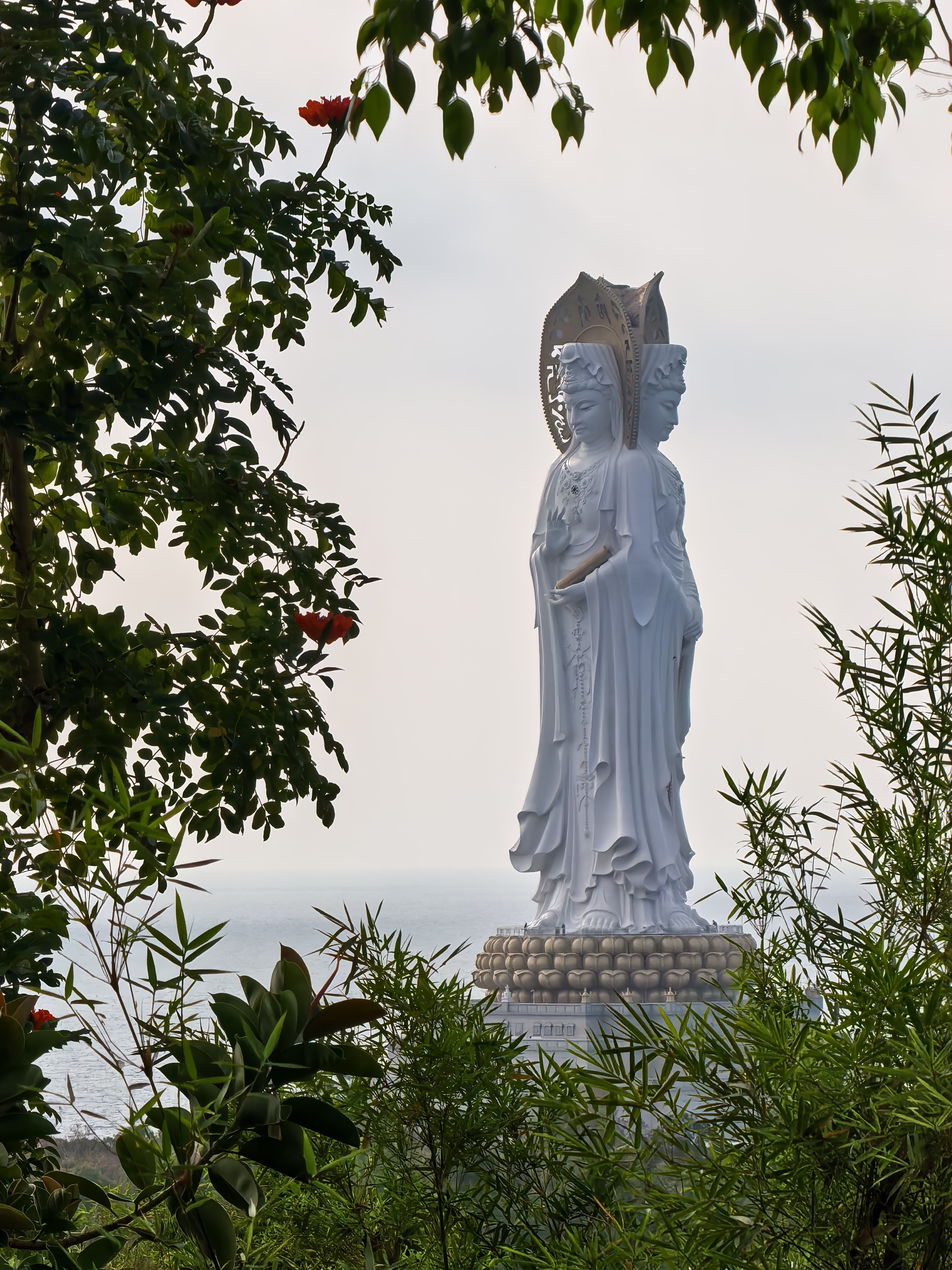 山门巍峨,颇有盛唐之风。进了门,两旁树木被日光洗得发亮,那种绿是鲜润的、饱满的,仿佛轻轻一碰就能滴下汁液来。有白鸽在檐间盘旋,从容得很,不避人,也不甚亲人,就那么自顾自地飞着,偶尔落在石阶上,歪着头看这看那。远处的海面灰蒙蒙的,与天色相接,分不清哪里是水、哪里是云。这地方确实是有些福地气象的——“福如东海长流水,寿比南山不老松”,站在这里望着那山海间的气象,倒觉得这话说得实在。
