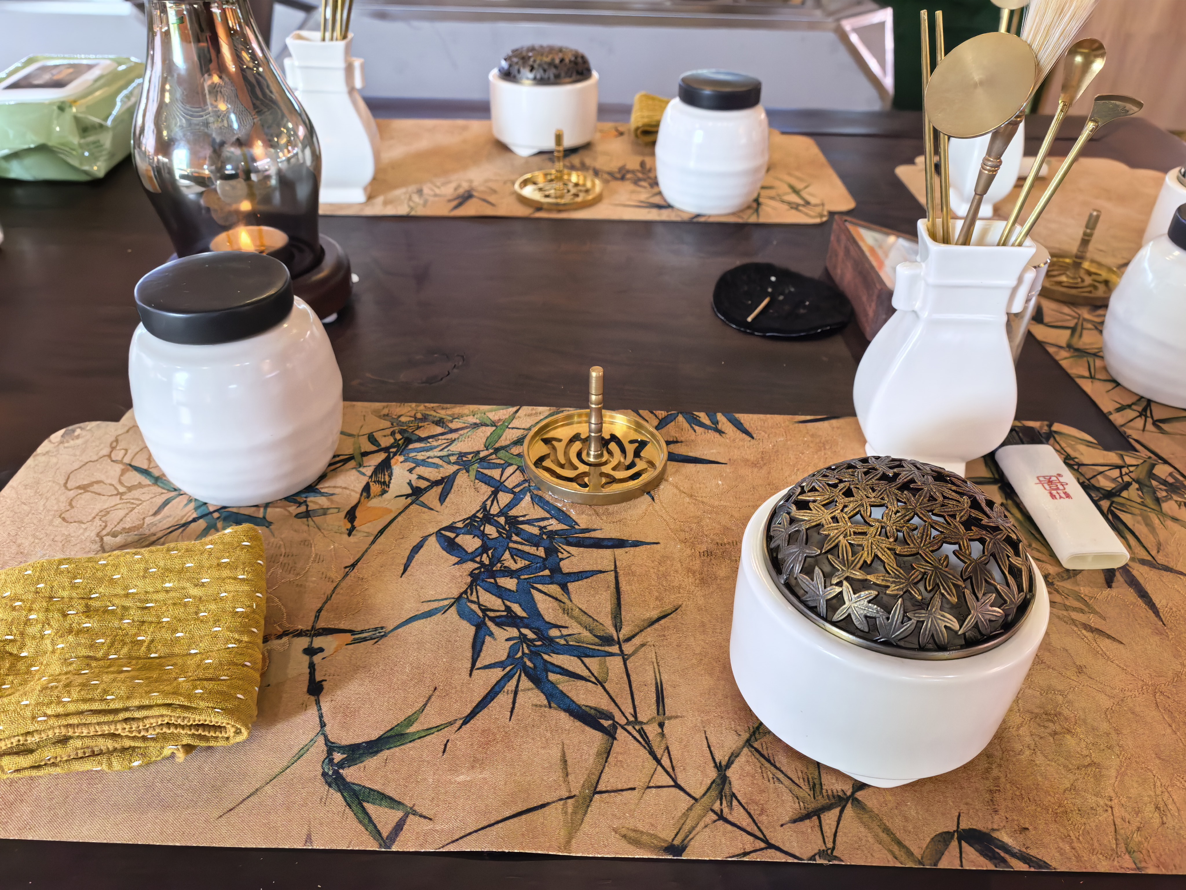 我点点头。他便引我到一张长案前。案上摆着一只青瓷碗,碗里盛着暗褐色的沉香粉,细得像尘,旁边放着一只小铜壶、一把竹尺、一块木板,还有一架小巧的线香机——一个铁铸的筒子,底部有细孔,配着一根长长的活塞。