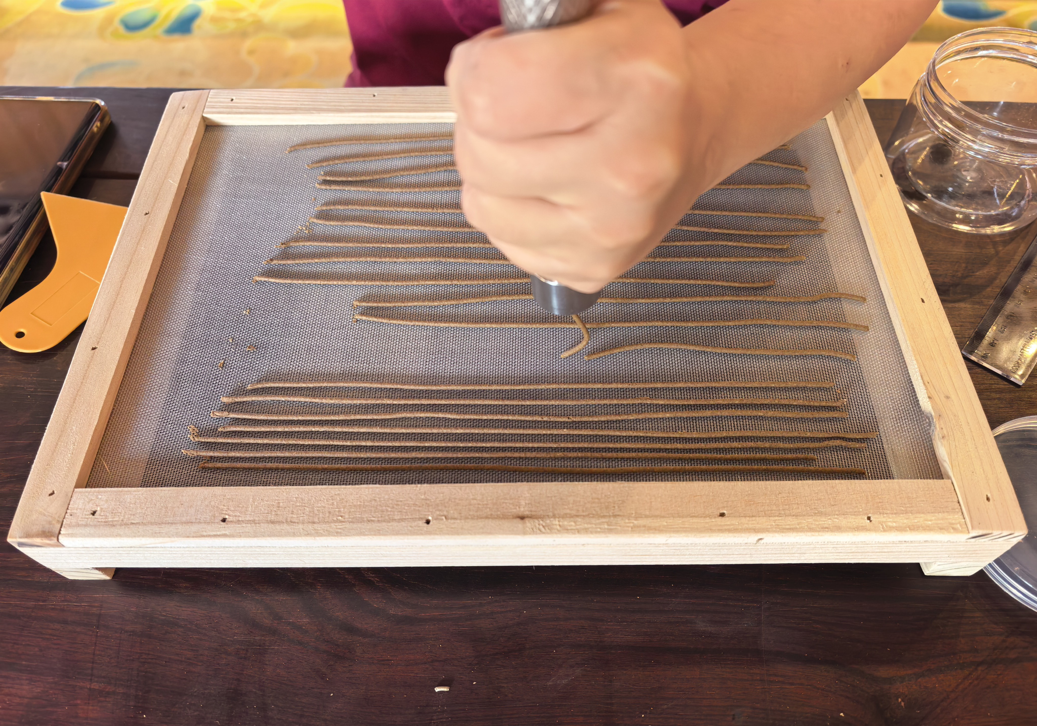 接着是第二根、第三根、第四根。每一根都要重新装泥,重新压实,重新挤压。到第三根的时候,我的手已经有些酸了,但心里反而静了下来,像是进入了一种节奏——装泥,压实,挤压,截断。重复,却不厌烦。每一根香都细细的、直直的,并排摆在木板上,像一队安静的小兵。