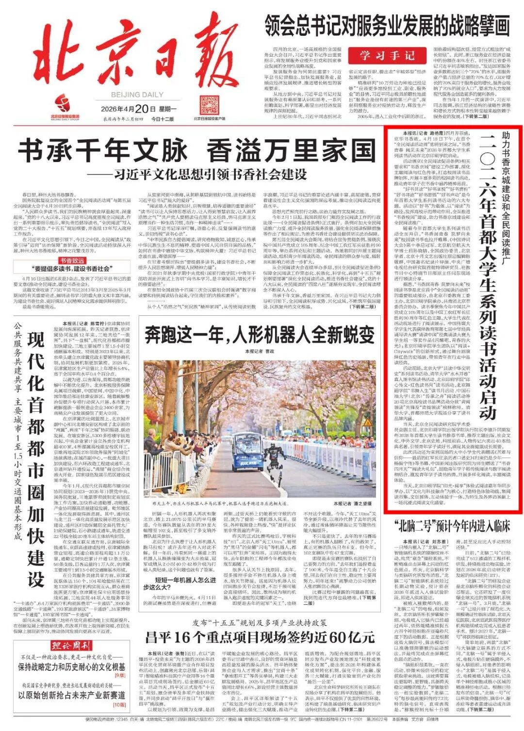 4月20日,北京日报头版刊发了《二〇二六年首都大学生系列读书活动启动》。全文如下:
