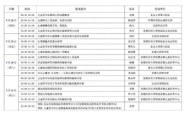 本次培训将为儿科专业医务人员提供临床心理评估的基础知识,提升儿科医生对精神心理问题的识别能力,同时也为开展跨学科研究奠定基础;为儿童青少年精神心理领域从业人员的岗前培训,提升专业技术能力;为心理治疗师和咨询师提供专业的评估工具及评估技能;为教育领域工作人员提供临床心理学的工作思路和测评工具;为儿童青少年领域科研工作者提供心理评估工具选择的基本技能及研发的基本思路。
