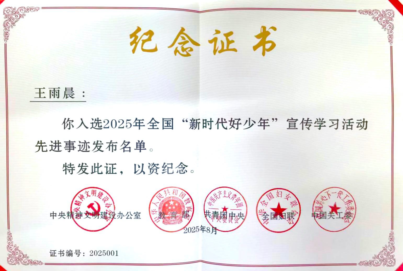 近日,中央文明办、教育部、共青团中央、全国妇联、中国关工委联合举办的2025年度全国“新时代好少年”先进事迹发布活动圆满落幕。我馆新青年志愿者王雨晨光荣入选全国“新时代好少年”。