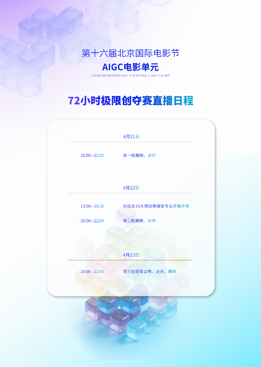 除了揭晓冠、亚、季军及“最佳AI技术创新”“最佳故事”等单项奖,我们还将邀请获奖的双人组合走上舞台,分享他们独一无二的创作秘辛:如何在72小时内高效分工?遇到了哪些意想不到的挑战?又是什么让他们坚信AI是电影的未来?