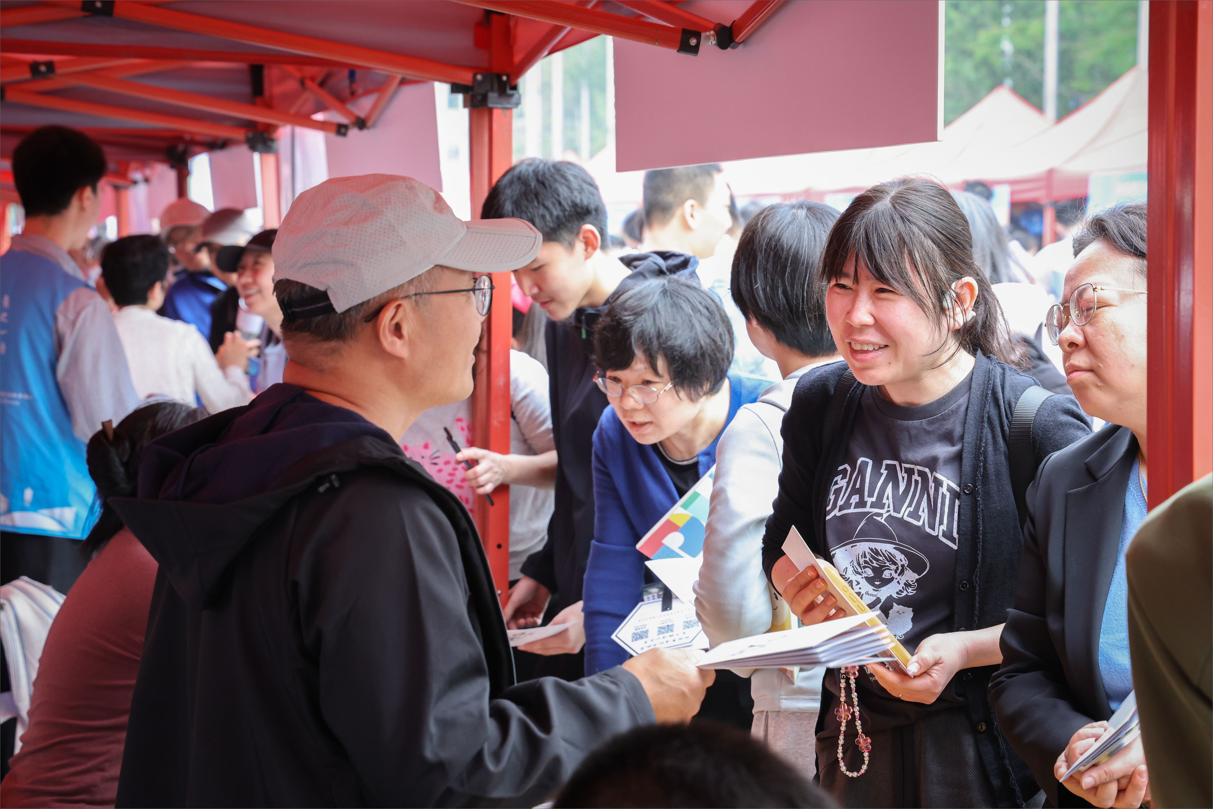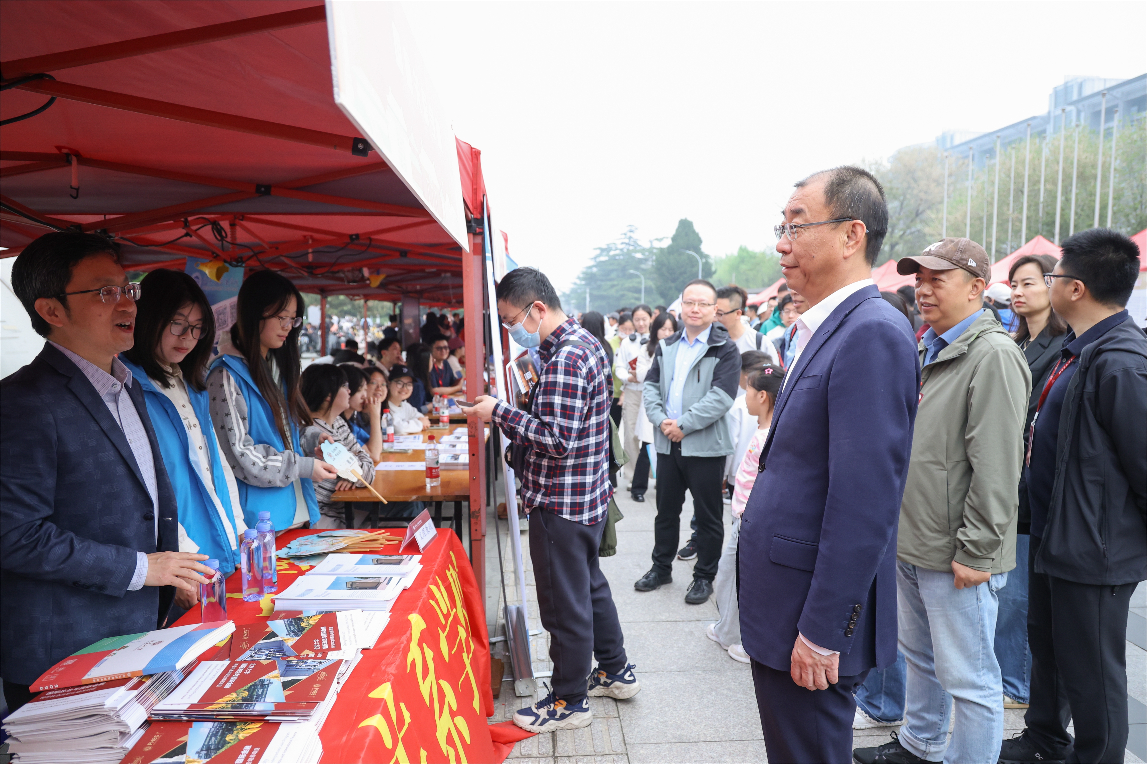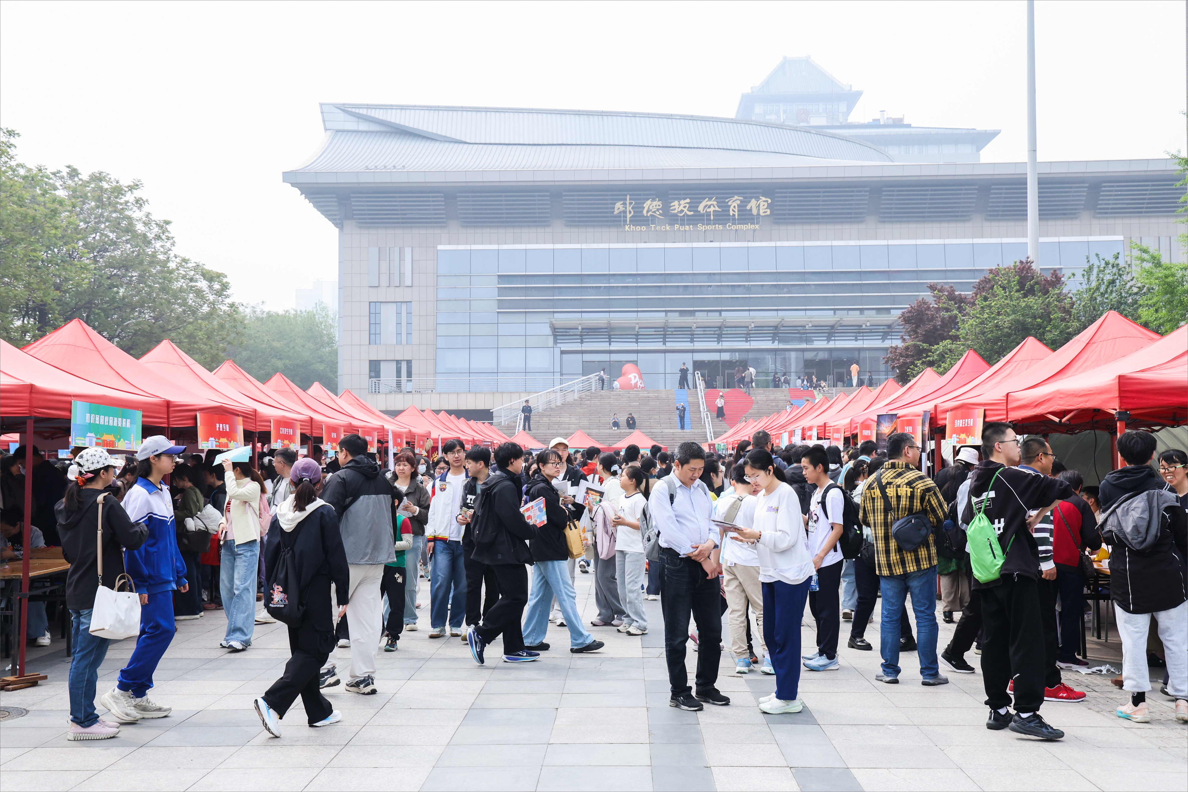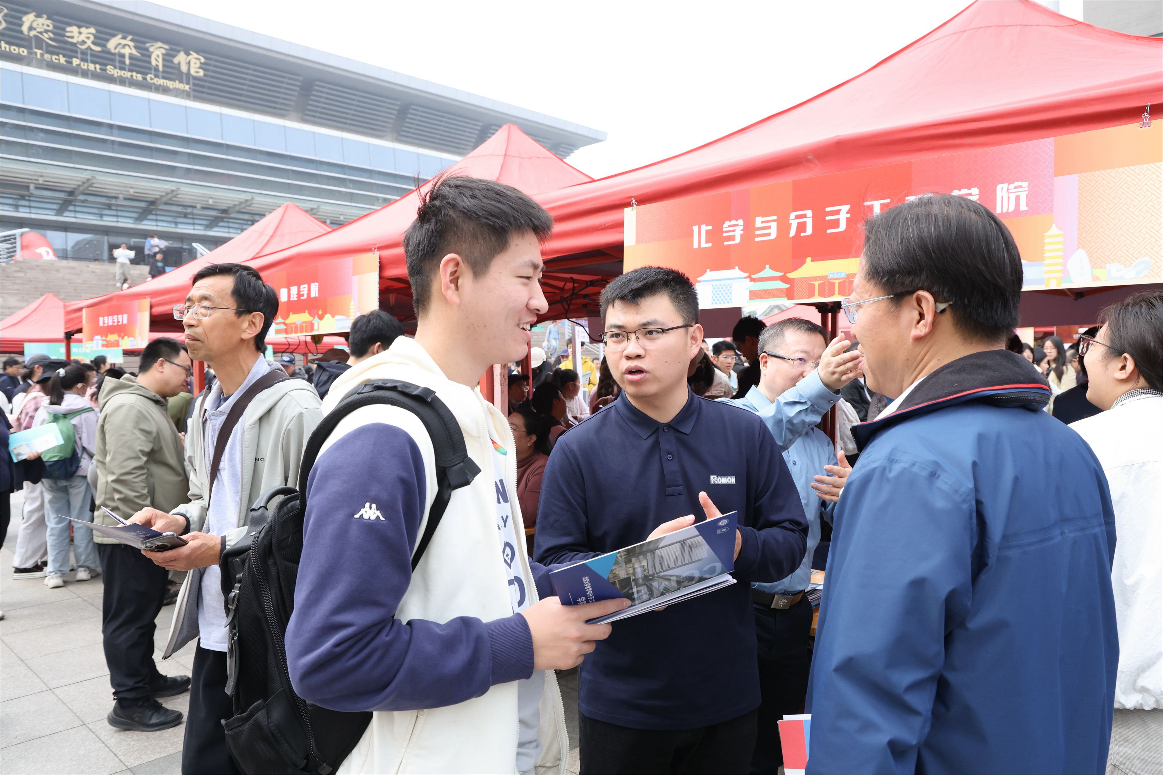邱德拔体育馆前广场的咨询区气氛火热,现场工作人员与学生志愿者以细致耐心的态度和清晰准确的解答,为前来咨询的学生和家长一一解惑。