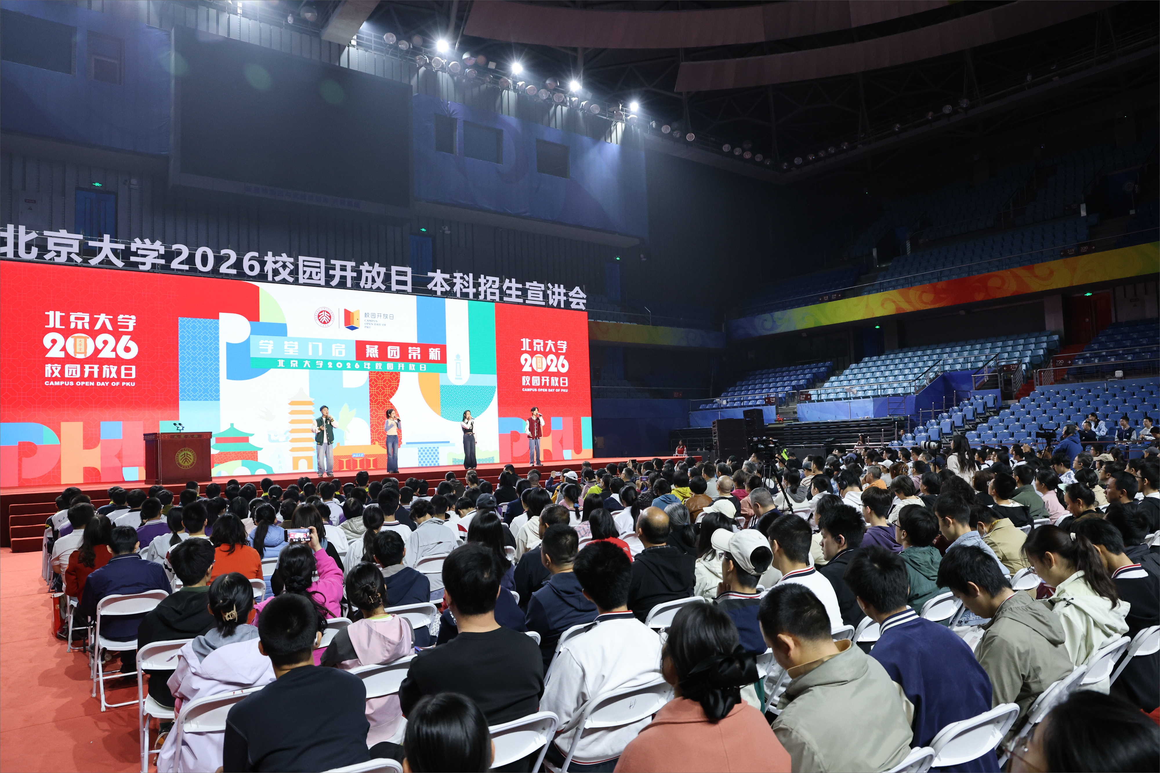 在邱德拔体育馆举行的本科招生宣讲会上,北京大学面向到场学生及家长,全面展示本科人才培养体系、核心育人理念和多元特色育人路径。招生办公室主任黄宗英主持。