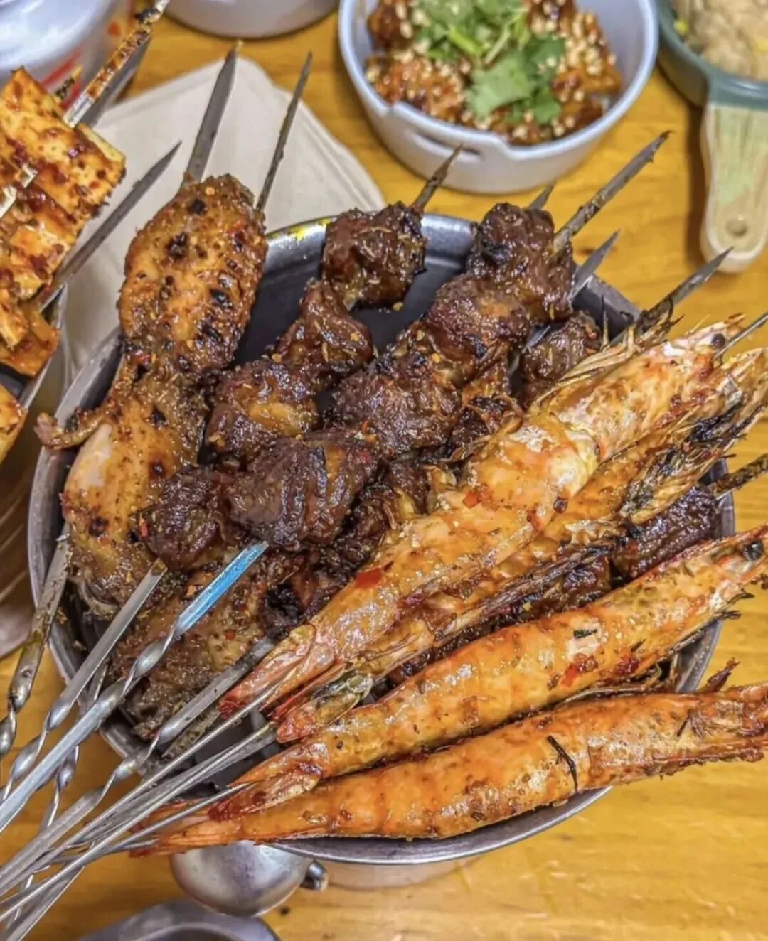 这份实在,早已融进后厨的每一道工序里。走进后厨,师傅们或是低着头认真地穿着串,或是按照比例现调料汁,“我们从不用代工厂,调料也都是后厨现调,如果省了事儿,味道就变了。”柳鹏说,牛肉串选用谷饲200多天的安格斯肥牛和黄牛吊龙,吊龙需用刀背敲断筋再腌制,烤至九成熟,嫩而不柴;泰式鸡肉串当天切、当天腌,避免脱料影响口感;烤鸡生蚝刷上日料烧汁,甜口酱汁裹着软嫩鸡肉,成了年轻食客的新宠,就连素串也毫不敷衍,西葫芦、土豆片、小蘑菇现穿现烤,保留食材本味,解腻又爽口。